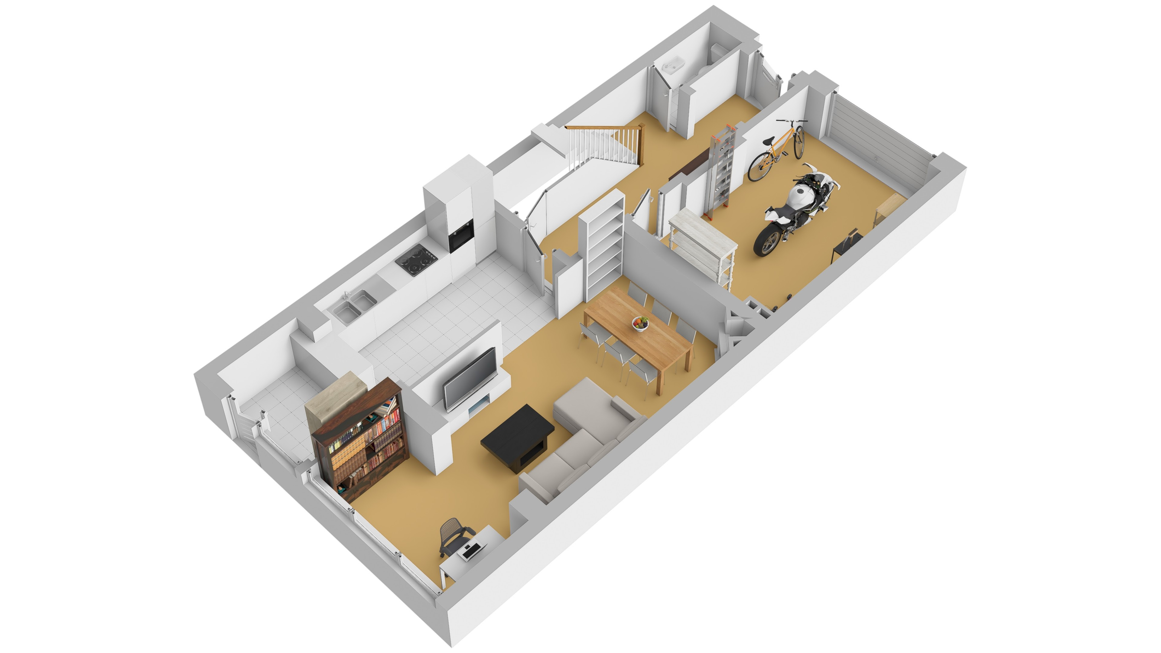 Le rez-de-chaussée se compose d’un hall d’entrée avec WC séparé, d’un séjour agrémenté d’un feu ouvert, d’un espace bureau ou salle à manger ainsi que d’une cuisine indépendante. Celle-ci donne accès à une cour extérieure, offrant un espace extérieur appréciable. Un grand garage complète ce niveau, un réel atout dans le quartier.