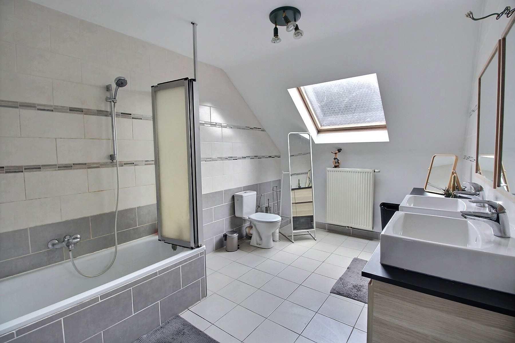 Venez découvrir cette magnifique villa de 265m² (selon PEB) ultra lumineuse construite en 2009, idéalement située à Tubize (Saintes) dans un quartier résidentiel calme et très recherché. Parfaitement conçue pour accueillir une famille, elle offre de superbes volumes et un confort optimal. Le rez-de-chaussée se compose d’un vaste hall d’entrée de 12,7 m² avec WC séparé et lave-mains, d’un grand séjour baigné de lumière de 33,56 m², d’une cuisine équipée de 12 m², d’une buanderie/espace de provisions de 7,44 m², ainsi que d’une chambre ou bureau de 16,4 m² avec salle de douche privative de 5 m². Un garage spacieux de 40 m² pouvant accueillir deux voitures complète ce niveau. À l’étage, vous profiterez d’un hall de nuit de 12,70 m² desservant quatre chambres de 18,38 m², 16,52 m², 16,52 m² et 15,6 m², ainsi qu’une salle de bain de 11,15 m² avec baignoire, meuble lavabo et WC. Une grande pièce polyvalente de 40 m² peut servir de salle de jeux ou de rangement. Un grenier supplémentaire est accessible par trappe. À l’extérieur, vous bénéficierez d’une vaste terrasse de ±60 m² orientée sud-est et d’un jardin entièrement clôturé, idéal pour la vie familiale. La maison dispose d’une installation électrique conforme, du chauffage central au gaz et d’un poêle à bois Stuv 30 compact avec kit masse. PEB C (244kwh/m².an), conso.totale: 64601 Kwh/an. Co2: 45kg. N°: 20251127015220. Prix : Faire offre à partir de 515.000 €. A visiter sans tarder : Sofoximmo – Sophie : 0471/85.36.79
